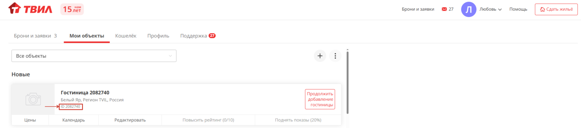 - ID объявления на ТВИЛ (скопируйте в разделе “Мои объекты”)